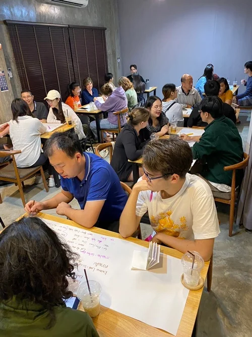 這是一個結合語言與文化交流的小型聚會。大家會分小組,用英文、泰文交流,聊泰國文化、生活、當地議題等。相比大型語言交換,這裡規模較小、聊天更深入,每一桌都會有泰國人帶領聊天,是認識泰國在地朋友的好地方喔!